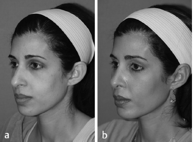 Fig. 14.1 (a) Before and (b) after photos of a patient who underwent cheek/malar augmentation with silastic implants.