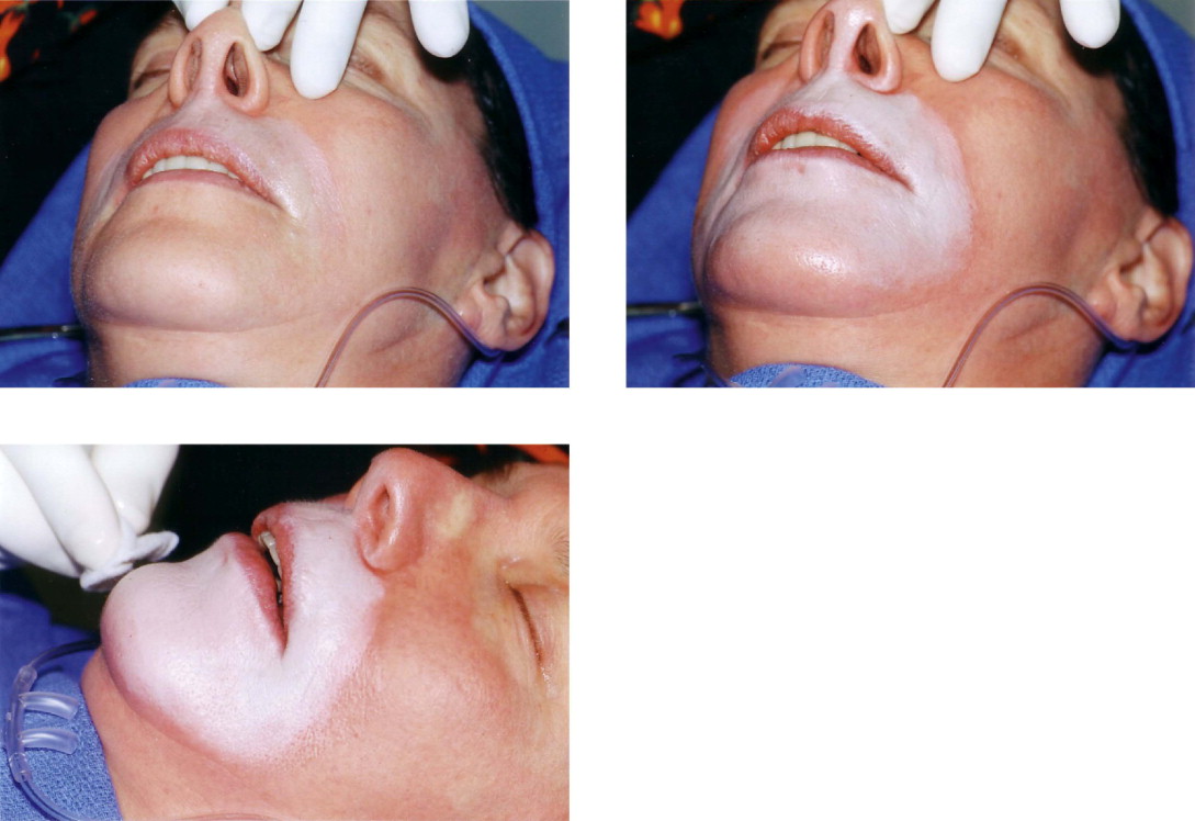 The different concentrations are placed in separate, easily identifiable bowls or cups. The applying materials are 2 × 2 gauze and cotton-tipped applicators. This gauze is dipped into the solution and carefully wrung out. The mixture is stirred prior to each application. An assistant helps dry the applying hand in order to prevent inadvertent application where it is not wanted. One must exercise constant vigilance in this respect. With the damp gauze in hand, multiple rubbings are made, observing the color change of the skin. The effect of the peel is to create a ‘frost’. The acid coagulates and precipitates the protein, forming a frost, which is a way of describing varying degrees of a white appearance. As the application progresses, the depth is gauged by the degree of frosting which becomes progressively more dense ( Figures 2.1–2.3 ). The speed of the appearance of the frost depends on the concentration used and how wet the gauze is. With the typical concentrations described and using a damp gauze, the appearance of the frost is gradual and can be seen in 10–20 seconds. Unlike peels with trichloroacetic acid (TCA), there is no need to wait several minutes to see the final depth.