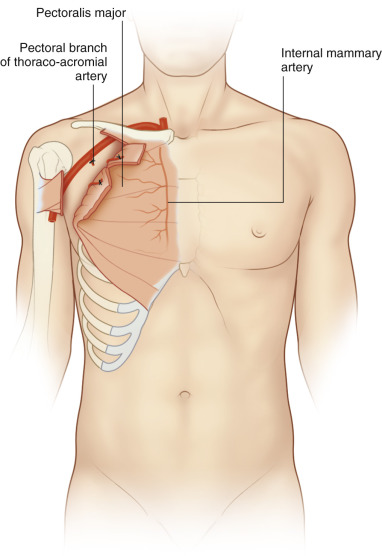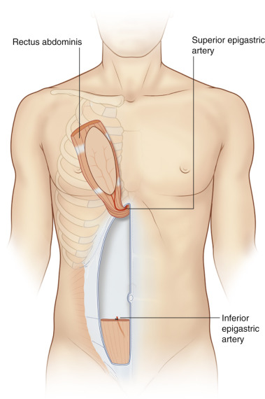 A fasciocutaneous flap, sparing the underlying rectus abdominis, is an alternative. Perforating vessels at the costal margin should be preserved. If a greater arc of rotation is needed, a cuff of rectus abdominis, including the superior epigastric vessels can be included at the costal margin.