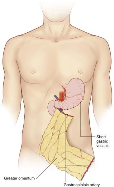 Details of omentum anatomy and dissection can be found in Chapter 36 . Once the omentum is dissected free, the flap is then passed into the chest defect via either a subcutaneous tunnel, which creates a hernia, or preferably via a right transdiaphragmatic route with the liver buttressing the defect. Use of the right gastroepiploic artery provides 5–10 cm greater arc of rotation and if the pedicle needs to be lengthened, internal longitudinal dissection can be performed due to the secondary arcade (Barkow’s arch) ( Fig. 17.4 ). Transdiaphragmatic harvest is also an option to avoid laparotomy for harvest.