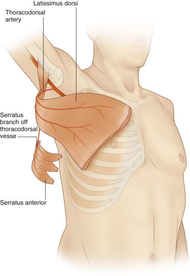 Details of latissimus dorsi anatomy and dissection can be found in Chapter 41 . Briefly, the flap is raised based on the thoracodorsal vessels and a subcutaneous tunnel is created in the axilla to the chest defect. If more reach is needed, the flap can be tunneled under pectoralis major or detached from the humeral insertion to gain approximately 5–10 cm. If a larger flap is needed, the latissimus dorsi can be taken with the serratus anterior ( Fig. 17.5 ). If a smaller flap is needed, the muscle can be split by taking muscle overlying only one of the thoracodorsal branches, thus preserving the other portion. The latissimus dorsi can be completely spared by raising a thoracodorsal artery perforator flap.