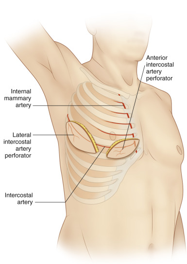 For anterior intercostal perforator flaps, the largest anterior intercostal pedicles are located in the 2nd–3rd intercostal spaces 1–3 cm lateral to the sternum. The flap design is usually longitudinal or oblique towards the ipsilateral shoulder. Dissection is performed in a latero-inferior to medio-superior direction and may need to proceed through the pectoralis major or rectus abdominis muscles.