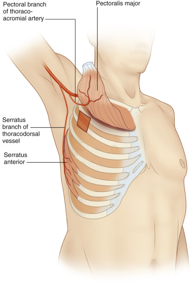 Some detail on the serratus muscle flap can be found in Chapter 41 . An oblique incision over the lateral chest wall is made and dissection proceeds between the anterior border of latissimus dorsi and inferolateral border of pectoralis major. The thoracodorsal vessels are identified and followed proximal to identify the branch to serratus anterior. Special care should be taken not to damage the pedicle, which lies superficial to the muscle. The long thoracic nerve is identified medial to the pedicle and preserved. The lower 3–4 segments of serratus anterior are harvested by dissecting anterior to posterior in a supraperiosteal plane. The upper segments of muscle are kept attached to the scapula to prevent winging of the scapula.