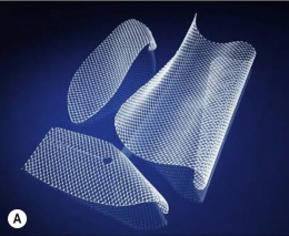 Implantable mesh products including polypropylene (A) , PTFE (Gore-Tex) (B) and acellular dermal matrix (C) .