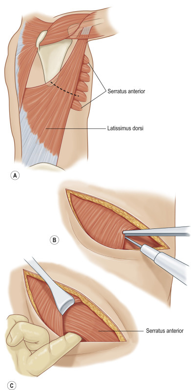 Muscle sparing tooracotomy: The lateral border of the latissimus muscle is identified (B) and retracted (C) so that the latissimus can be spared.
