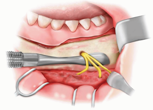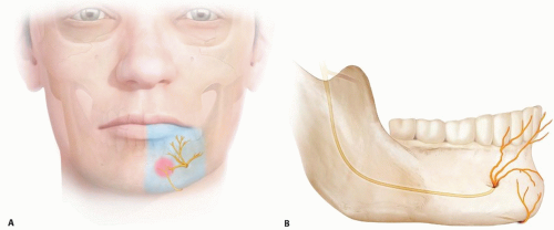 The mental nerve is the terminal branch of the inferior alveolar nerve. It is a branch of the third division of the trigeminal nerve and is responsible for sensation of the lower lip, portions of the chin pad, and menton (FIG 1A, blue area) except for a small area that is supplied by a sensory branch off the nerve to the mylohyoid (see FIG 1A, pink area; FIG 1B).