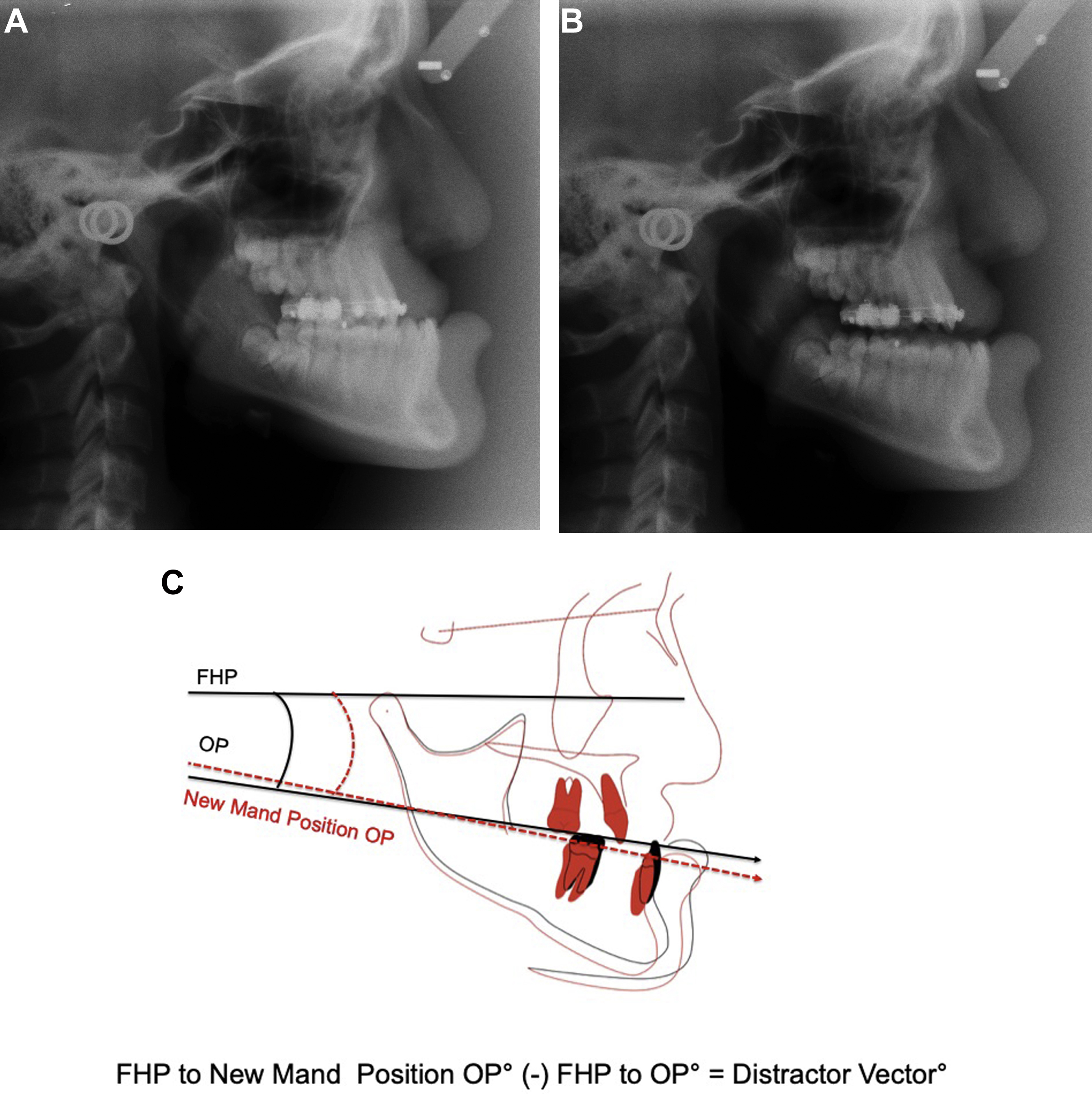 Thorough facial and intraoral examination with speech velopharyngeal evaluation is performed in all patients. Traditional cephalometry (with hand tracing), digital cephalometry, or 3-dimensional virtual surgical planning can be used. The planning radiograph or 3-dimensional scan is obtained with the lips in repose and the teeth in full occlusion. If the patient has vertical maxillary hypoplasia, the clinician should determine the degree of vertical overclosure, as a radiographic record taken in an overclosed position will disrupt accurate presurgical planning in several ways ( Fig. 1 A). First, the predicted maxillary advancement will be greater than what will be required. Second, the upper lip form will be abnormal in the study photographs and radiographs. Third, an incorrect mandibular occlusal plane measurement will be recorded, leading to an inappropriate maxillary distraction vector. If the patient exhibits overclosure, the radiographic record is taken with the mandible in rest position and the lips in repose. To assure accuracy of the mandibular position, a central relation registration bite is obtained and used while the necessary facial photographs and radiographs are taken ( Fig. 1 B). The radiographs are traced to determine the mandibular occlusal plane and the distraction vector of the maxilla. The maxillary occlusal plane is drawn and compared with the mandibular plane relative to Frankfort Horizontal Plane. The difference between the two is the desired vector ( Fig. 1 C). It is also critical to know the location of the approximate center of mass of the bone segment to be distracted. , In the sagittal plane, force vectors passing above, through, or below the center of mass will rotate the segment in a clockwise, straight, or counterclockwise direction respectively. In the maxilla, the approximate centers of mass and resistance are located above the mesial root of the first molar. The position of the eyelets on the external traction hooks is lateral to the alar cartilages bilaterally and at or above the level of the nasal aperture or palatal plane. It is important to record tooth shown in repose and the maxillary dental midline relative to the skeletal midline. If they are different, the distractor device needs to be differentially activated to correct the midline. When utilizing the HIMXD, the midline can be corrected at the time of device placement with fine adjustment in yaw position, then at the end of activation with differential final extension of the right and left devices. The RED and HIMXD systems allow for correction of the inferior pitch, as well as yaw. The RED system also has the capacity for a degree of roll correction. These adjustments are done by differentially activating the distraction screws, repositioning the horizontal distractor bar toward the right or left, then differentially altering the superior or inferior position of the distraction screws mounted on the horizontal bar combined with the use of interarch elastics ( Fig. 2 ).