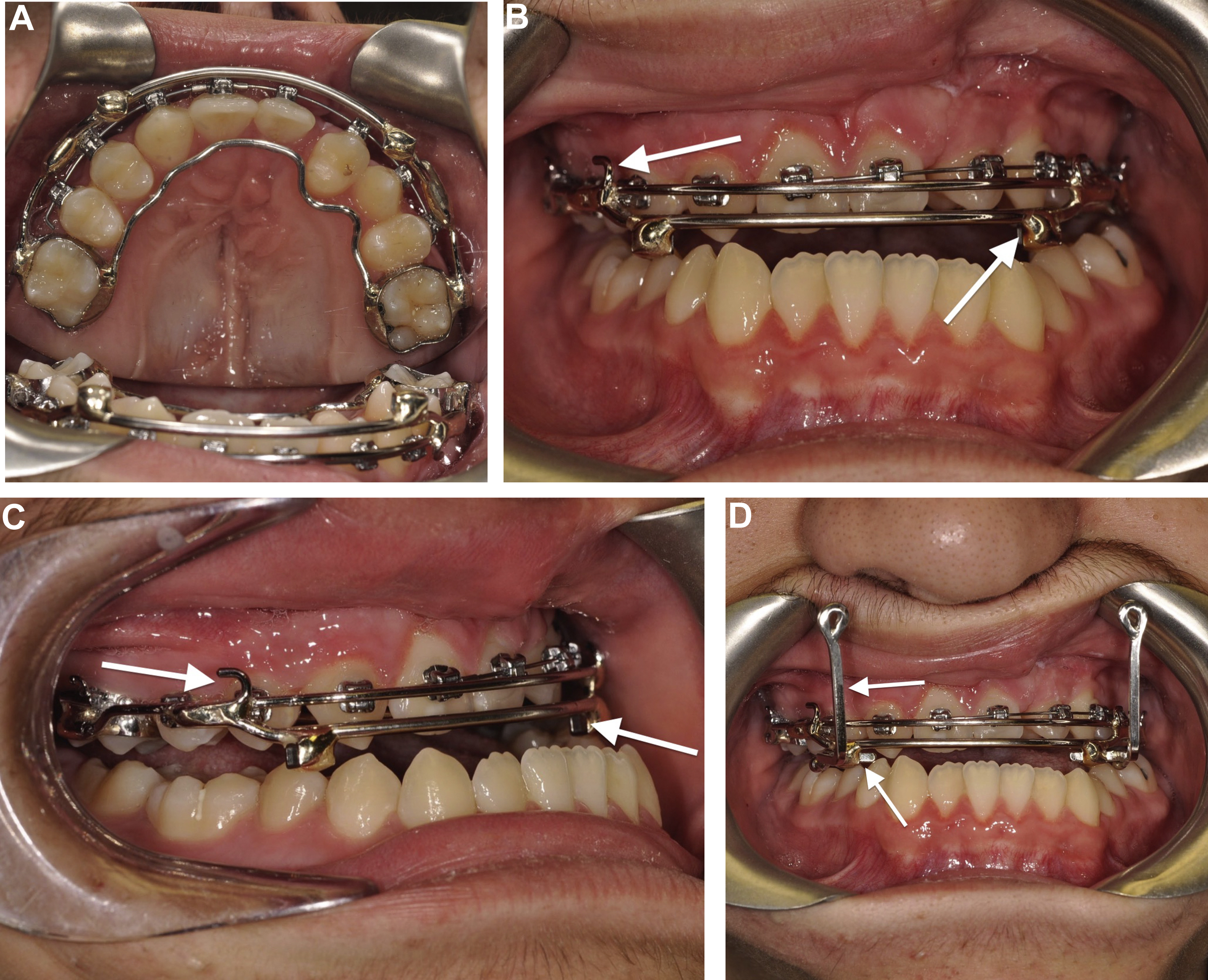 For both external and internal distraction devices, the authors use 0.040″ stainless steel wire conformed to the labial and palatal aspects of the dental arch and soldered to the first molar bands ( Fig. 3 A–C). If desired, additional teeth can be incorporated for added retention of the appliance. In younger patients undergoing RED distraction, maxillary second primary molars can be used to support the splint if they have adequate root support and are stable. The RED splint has 2 square tubes just medial to the oral commissures that are used to secure 2 removable rectangular hooks, which connect the intraoral splint to distraction screws mounted onto the RED system. , The height of the traction hooks is such that they are level to or above the palatal plane for vector control (see Fig. 2 ; Fig. 3 D).