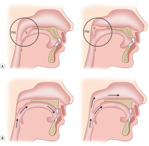 (A) In the lateral cephalogram, the soft palate or velum (V) is shown at rest (above left) and during speech, making contact with the posterior pharyngeal wall (PW) (above right). (B) This line drawing shows the air flow during normal speech (left), with the velum making contact with the posterior pharynx to direct air out the mouth. If the velum is too short or movement is inadequate (right), air can escape through the nose during speech, creating velopharyngeal insufficiency (VPI).