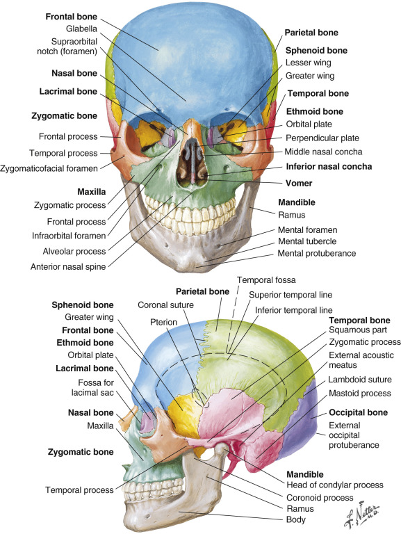 The facial skeleton is complex, made up of several individual bony structures, articulated in a complex manner ( Fig. 10.1 ). The calvarium, consists of frontal, parietal, temporal and occipital bones which protects the brain. The cranial bones in turn articulate with the skull base (sphenoid bone) and midfacial skeleton consisting of the maxilla, ethmoid, lacrimal, zygomatic, nasal, palatine, nasal concha, and vomer. The facial skeleton provides protection of delicate structures such as the eye, and also provides pro­tective passage for some vital structures such as the facial nerve, which passes through the temporal bone. Other clinically important nerves to be considered during craniofacial surgical exposures include the supraorbital and supratrochlear nerves (V1), the infraorbital nerve (V2), the inferior alveolar nerve (V3), and its terminal branch, the mental nerve. The supraorbital nerve exits the frontal bone through a foramen or a notch. In elevation of a bicoronal flap or a paramedian forehead flap, transition to subperiosteal dissection 1–2 cm above the supraorbital rim avoids injury to the supraorbital nerve or supratrochlear neovascular bundle. The infraorbital nerve exits the infraorbital foramen 6–11 mm below the inferior orbital rim at the midpupillary line. The mental nerve exits the metal foramen in the body of mandible between the root apices of the mandibular first and second premolars. The ethmoid, sphenoid and maxillary bones, house the intricate system of air cells and sinuses that contribute to humidification of inspired air, and resonance for voice reproduction. The mandible not only provides the structure that defines the appearance of the lower face but, combined with its sister bone, the maxilla, provide a housing for the dentition and defines the confines of the oral cavity and all that it contains. Finally, the facial skeleton also provides the framework from which the facial muscles take origin.