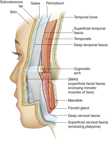 Galea, periosteum on scalp, superficial temporal fascia, deep temporal fascia, zygomatic arch, SMAS (musculo-aponeurotic), superficial cervical fascia and deep cervical fascia.