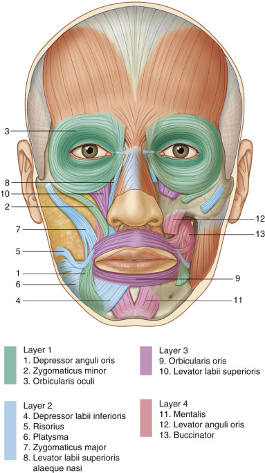 The facial muscles are complex. They consist of the muscles of facial expression as well as the muscles of mastication. In general, the muscles of facial expression are thin ribbons of muscle arranged in a radial pattern around the sphincters of the eye (orbicularis oculi) and the mouth (orbicularis oris). They consist of 17 paired muscles that give the human face the ability to move in multiple vectors or combinations of vectors and, as already mentioned, provide a significant contribution to non-verbal communication. The muscles of facial expression glide over an intricate system of fat pads in the face. Superiorly, the paired frontalis muscles insert into the galea aponeurotica, which forms an intermediate aponeurosis with the paired occipitalis muscles. Lateral to the superior temporal line, the temporoparietal fascia is continuous with the galea. The mimetic facial muscles originate from the facial skeleton and insert into the skin that they animate. These muscles are innervated by the facial nerve and, as a general rule, the facial nerve branches enter the deep surfaces of these muscles, except for the mentalis, levator anguli oris, and buccinator. They are arranged in four layers ( Fig. 10.3 ). Layer 1 (the most superficial) includes the depressor anguli oris, zygomaticus minor, and orbicularis oculi. Layer 2 includes the depressor labii inferioris, risorius, platysma, zygomaticus major, and levator labii superioris alaeque nasi. Layer 3 includes the orbicularis oris and levator labii superioris. Layer 4 (the deepest layer) includes the mentalis, levator anguli oris, and buccinator. Layer 4 muscles are innervated by the facial nerve on their superficial surfaces. The SMAS layer, which invests the mimetic muscles, is continuous inferiorly with the platysma. The buccinator, also innervated by the facial nerve, and strictly speaking not a masticatory muscle, assists in chewing, by keeping the food bolus within the occlusal plane of the molars. Posteriorly, it inserts into the pterygomandibular raphe, which separates it from the superior pharyngeal constrictor posteriorly. It is used in whistling and smiling, and in the neonate, is the muscle that assists suckling. The true muscles of mastication consist of the paired temporalis, masseter and the pterygoid muscles (medial and lateral). Unlike the muscles of facial expression, which are all innervated by the facial nerve (CN VII), the four muscles of mastication are all innervated by the mandibular branch of the trigeminal nerve (CN V). The temporalis muscle arises from the superior temporal line and the temporal fossa, its fan-shaped origin coalesces inferiorly as its fibers pass medially to the zygomatic arch to insert onto the coronoid process of the mandible and anterior border of the ramus. This muscle is supplied by branches the internal maxillary artery, namely the anterior and posterior deep temporal arteries, which enter the muscle on its deep surface anterior and posterior to the cornoid process, respectively. An additional arterial supply is the middle temporal artery, a branch of the superficial temporal artery, which supplies the deep temporalis muscle fascia. This muscle has several applications for local reconstruction of defects of the cheek, orbit and in facial reanimation. A powerful mandibular elevator, the masseter muscle arises from the lower border of the zygoma and the most anterior fibers arise from the zygomatic process of the maxilla and inserts into the lateral surface of the mandible. The masseter muscle is innervated by the masseteric nerve, a branch of V3, which reaches the deep surface of the muscle through the coronoid notch. The blood supply to the masseter is furnished by the masseteric artery, a branch of the internal maxillary artery. Individuals of these muscles are expendable so the nerve to the masseter can be used to innervate a free functional muscle transfer for the treatment of facial paralysis.