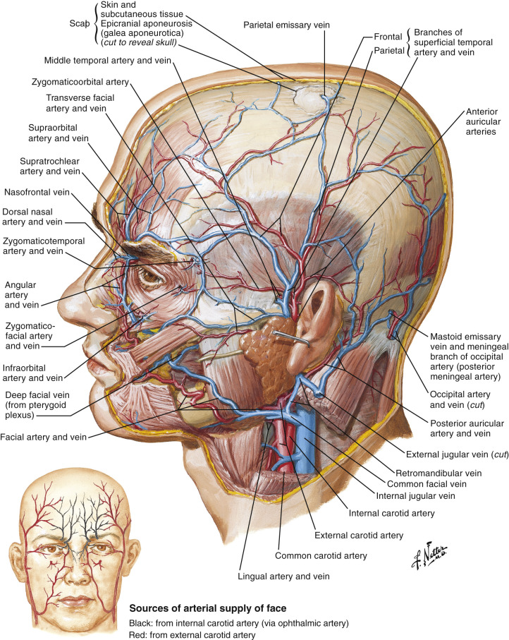 The head and neck is one of the most highly vascularized regions in the body ( Figs 10.4 and 10.5 ). The external carotid arterial system supplies most of the skin of the head, with the exception of a central triangle that includes the eyes, the bridge of the nose, and a central portion of the forehead. This latter area is vascularized by the ophthalmic branch of the internal carotid artery. The superficial temporal, posterior auricular, and occipital arteries supply the scalp. Most of the external carotid branches are commonly used for microvascular anastomosis, however, the four most commonly used recipient vessels for head and neck reconstruction are: the facial artery; the superficial temporal artery; the superior thyroid artery, which are branches of the external carotid artery; and the transverse cervical artery, a branch of the thyrocervical trunk.