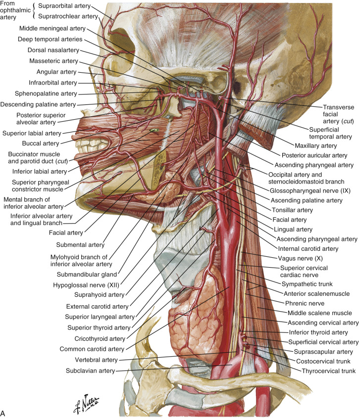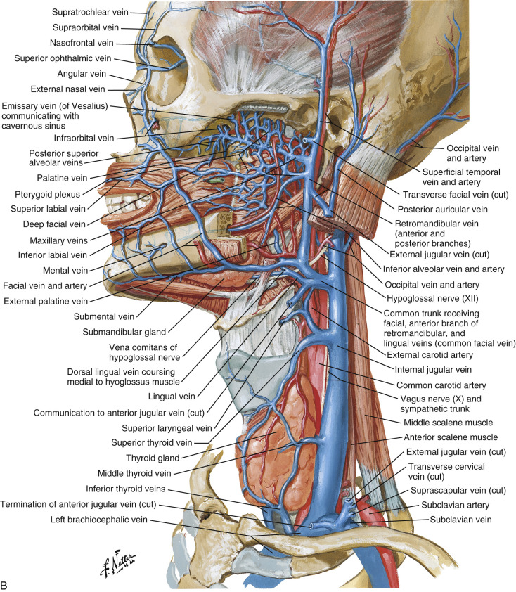 (A) Arteries of oral and pharyngeal regions; arterial supply of the mouth and pharynx blood supply of the mouth and pharynx muscles of pharynx: lateral view. (B) Veins of oral and pharyngeal regions; venous drainage of the mouth and pharynx.