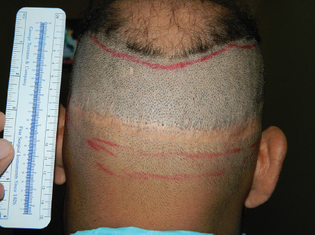 In our setting, the sutures (nonabsorbable) are removed after 10 to 12 days. The tensile strength of the wound is around 7 to 10% at this time. If there is tension due to tight closure of the wound placed below the superior nuchal line, it is subjected to the forces, which results in the widening of the scars. If the sutures are removed earlier, chances of wound dehiscence exist, especially in patients undergoing a second session.