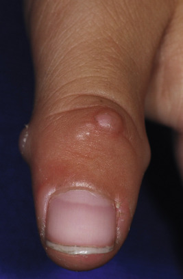 Fibroblastic rheumatism. Firm skin-colored papules and nodules on the fingers and palm of this young boy with juvenile idiopathic arthritis.