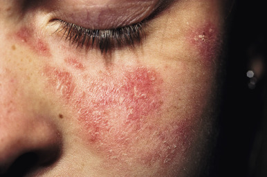 Systemic lupus erythematosus. Mild scaling and erythema of the malar rash.
