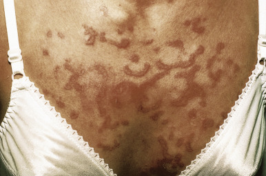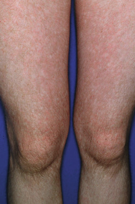 Several cutaneous features of JDM are seen more commonly with disease chronicity. Many children and adolescents with chronic disease have intensely pruritic, xerotic skin that shows poikiloderma ( Fig. 22-29 ), which is the combination of cutaneous atrophy, telangiectasia, and dyspigmentation (see Chapter 11 ). The scalp is dry, scaling, and pruritic as well.