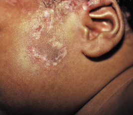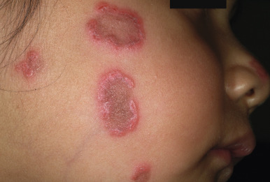 Discoid lupus erythematosus (DLE). This young girl showed well-circumscribed, elevated, indurated, red to purplish annular plaques of DLE.