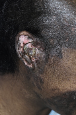 Discoid lupus erythematosus (DLE). The ear is often involved with DLE. Note the well-defined plaques of purplish erythema, focal overlying scaling, and postinflammatory hyperpigmentation and depigmentation.