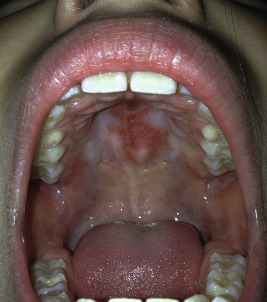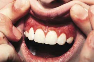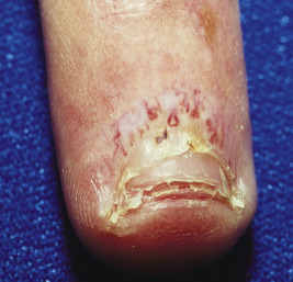 Periungual telangiectasia ( Fig. 22-25 ) is a characteristic feature of JDM and provides a good indication of cutaneous, rather than muscle, disease activity. Viewing the nailfold area through a dermatoscope, ophthalmoscope, or otoscope to magnify the area after local application of mineral oil improves visualization. Nailfold capillary microscopy has shown that the periungual telangiectasia represents bushy capillary loops adjacent to avascular areas, perhaps a form of compensatory neovascularization. Erythema of the cuticle at the base of the nails commonly accompanies the periungual telangiectasia. At times, the cuticles may also be thickened, hyperkeratotic, and irregular, giving an appearance of excessive picking or manicuring. Pitted ulcerations of the fingertips, pressure points such as the elbows, lateral aspects of the trunk, axillae, and lateral ocular canthi are usually seen at presentation or with disease flares. Thought to be a marker of severe disease, these ulcers leave residual atrophic scars. Even though not exposed to sun, the mucous membranes often show telangiectatic involvement, with erythema of the palate and buccal mucosa, with or without ulceration, and telangiectasia of the gum margin ( Fig. 22-26 ).