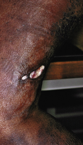 Cutaneous calcinosis develops in 18% to 24% of children, in contrast to the up to 70% incidence of earlier reports. This decreased incidence of calcinosis can be attributed to both earlier diagnosis and to more aggressive, earlier treatment (see below). Nevertheless, calcinosis is a major cause of morbidity in JDM and is linked to younger age at disease onset, more persistent disease activity, and the presence of anti-NXP2 (anti-p140) autoantibodies before the calcinosis develops, which are found overall in 20% of JDM patients. Most commonly seen at sites of trauma, particularly on the buttocks, elbows, knees, and fingers, and around the shoulders, subcutaneous calcium deposits may produce local pain and can be extruded, leading to ulcers, sinuses, or cellulitis ( Fig. 22-30 ). Ulcerations may also appear in children with dermatomyositis without calcifications, especially over joints ( Fig. 22-31 ). Calcifications (see Chapters 9 and 23 ) appear as hard, irregular nodules that may drain a whitish, chalky material through their openings to the surface that resembles gritty toothpaste. The mean time to occurrence of calcinosis after onset is 2.5 to 3.4 years, although 3% of patients have calcinosis at diagnosis, even without evidence of myositis. Sometimes patients have widespread calcification along fascial planes, encasing muscles (universalis form) or even appearing as an exoskeleton on radiographic examination.