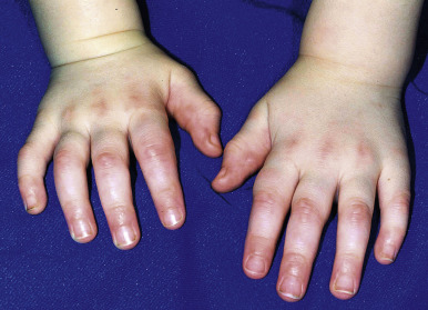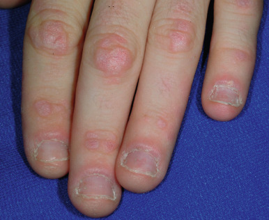 Juvenile dermatomyositis. Gottron papules overlying the joints of the hands. Note the telangiectasia and cuticular hypertrophy of the periungual areas.