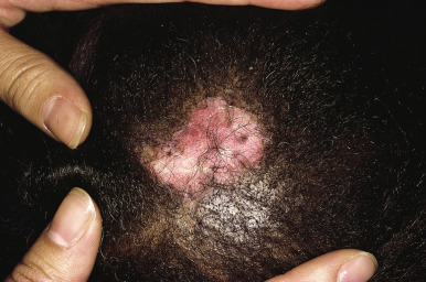 CCLE is an umbrella term used to describe lesions of discoid lupus erythematosus (DLE), lupus panniculitis, and chilblain lupus. Individual lesions of DLE are well-circumscribed, elevated, indurated red to purplish plaques with adherent scale ( Figs. 22-6 and 22-7 ) and fine telangiectasia. When untreated or as a sequela, discoid lesions may develop persistent areas of hyperpigmentation or hypopigmentation with atrophy. Discoid lesions can be asymmetric and are often exacerbated by exposure to UV light. DLE is most commonly found on the face, often with lesions on the ear helices and conchal bowls. Although the face is often the sole site of DLE without SLE, the scalp, arms, legs, hands, fingers, back, chest, abdomen, and even mucosal areas ( Fig. 22-8 ) may also be involved. At times the openings of hair follicles are dilated and plugged by an overlying scale. If the scale is thick enough, it can be lifted off in one piece. The undersurface then reveals follicular projections that resemble carpet tacks, a characteristic sign of LE. Discoid lesions have been described in a linear orientation that follows the lines of Blaschko.