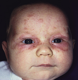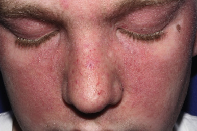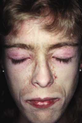 Juvenile dermatomyositis. Telangiectasia and inflammation of the face. Note the sparing of the infraorbital, sun-shielded area.