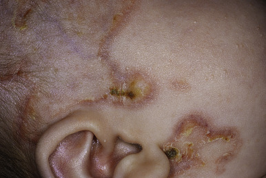 SCLE, which represents 10% to 15% of all cases of CLE, only occasionally occurs in pediatric patients. The cutaneous lesions of SCLE arise quite suddenly, mainly on the upper trunk, extensor surfaces of the arms, and dorsal aspect of the hands and fingers. The lesions may be annular and may enlarge and merge into psoriasiform or polycyclic lesions with thin and easily detached scales ( Fig. 22-5 ). UV light is usually associated with exacerbations, but lesions tend to be nonscarring. Although arthritis and fatigue are common, patients usually only have mild systemic manifestations. The majority of patients with SCLE have anti-Ro (SS-A) antibodies and many have anti-La antibodies. Nonbullous annular lesions that clinically and histologically resemble Sweet syndrome (see Chapter 20 ) can also been seen as a manifestation of SLE; biopsy shows unique histologic features called the histiocytoid form of neutrophilic dermatosis. Rowell syndrome was originally described as an erythema multiforme-like eruption in association with lupus (classically CLE), anti-La antibodies, and speckled ANAs; although controversy exists, most of these cases are probably SCLE or the concurrence of lupus and erythema multiforme. SCLE is treated by strict sun protection, topical anti-inflammatory agents, antimalarials, and occasionally systemic corticosteroids.
