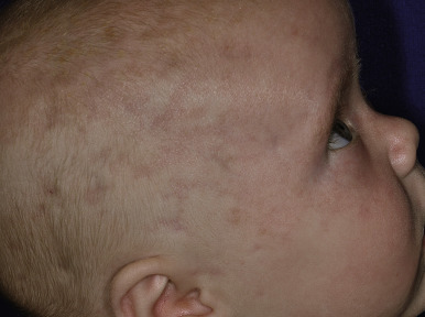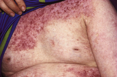 The cutaneous features of JDM may be striking or so minor that they might be easily overlooked. A variety of cutaneous findings maybe noted (see Box 22-4 ). Characteristic cutaneous lesions are inflammatory and telangiectatic and are found in 75% of affected children at presentation. A purplish-red erythema occurs on the face, especially on the eyelids, and is called the heliotrope rash, because it matches the color of reddish purple flower of the heliotrope plant ( Fig. 22-22 ). The eruption can also be seen on the upper cheeks, forehead, temples, and ears ( Fig. 22-23 ). Sometimes the facial lesions are very edematous, leading to a periorbital and cheek edema. The facial edema and discoloration may be asymmetric, reflecting asymmetric disease activity; JDM has also first manifested in a Blaschkoid facial distribution with later involvement in a generalized distribution. Violaceous, often confluent, telangiectatic erythema with fine scaling may also appear at the hairline of the scalp, nape of the neck, extensor surfaces of the arms and shoulders, the elbows and knees, and the shoulder and center of the upper anterior trunk (the shawl sign) ( Fig. 22-24 ). These telangiectatic eruptions are often accentuated when the affected area is dependent (e.g., with lowering the face for facial lesions). The distribution of the eruption and the common sparing of sun-protected areas suggest photosensitivity; UV light exposure is known to trigger both cutaneous and muscle signs.