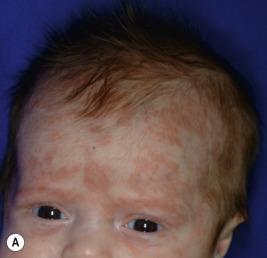 Of the various forms of JIA other than psoriatic arthritis, systemic-onset disease is the only one with known cutaneous findings. Its underlying pathomechanism involving dysfunction in the innate immune system, its clinical features, and its poor response to therapies that ameliorate other forms of JIA have led several investigators to classify systemic JIA as an auto-inflammatory, rather than autoimmune, disease (see Chapter 25 ). Systemic-onset disease affects boys and girls equally. The eruption of systemic-onset JIA is usually intermittent, occurring most often when patients have their characteristic daily or twice daily spiking fevers. The fevers generally reach 39° C or higher, and the children appear acutely ill with exacerbation of joint pain when fevers occur. The characteristic flat to slightly elevated macules or occasionally papules may resemble urticaria but are not pruritic. They typically measure 2 mm to 6 mm in diameter. Lesions vary from salmon-pink to red and display a characteristic slightly irregular or serpiginous margin. The blanching macules are often evanescent and commonly subside during periods of remission and a few hours after defervescence. Individual lesions may coalesce to form large plaques 8 to 9 cm in diameter. The eruption occurs predominantly on the trunk but often affects the extremities and occasionally the face ( Fig. 22-1 ); it is accentuated by local heat or trauma. Seen in 25% to 50% of patients, it may precede fevers or visceral involvement by up to 3 years. In some patients the rash occurs during a period of only 1 week, in others for a year or more. Persistent pruritic papules and plaques can occur in children with systemic JIA (and more often in adults). Biopsy helps confirm the diagnosis and shows dyskeratosis of the upper epidermis and sparse inflammation.