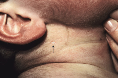 Although more characteristic of SLE, scleroderma, and dermatomyositis, patients with JIA may also demonstrate cuticular telangiectasias. Subcutaneous nodules rarely are seen in children with JIA and occur most commonly in patients with RF-positive polyarthritis, particularly if the disease is recalcitrant to therapy. Barely palpable to several centimeters in size, they may be the first presenting sign of JIA. Their most common location is near the olecranon process on the ulnar border of the forearm. Less commonly they may occur on the dorsal aspect of the hands, on the knees and ears, and over pressure areas such as the scapulae, sacrum, buttocks, and heels. In the areas of fingers and toes, subcutaneous nodules are only a few millimeters in size. Subcutaneous nodules are firm and nontender and may be attached to the periarticular capsules of the fingers. They can be easily confused with the subcutaneous form of granuloma annulare (see Chapter 9 ). Rheumatoid nodules and JIA must also be distinguished from fibroblastic rheumatism, a rare disorder characterized by the sudden but sometimes progressive onset of cutaneous nodules ( Fig. 22-2 ), flexion contractures, and polyarthritis. Some affected individuals respond to methotrexate or interferon (IFN)-α. Methotrexate and tumor necrosis factor (TNF) inhibitor treatment have been linked to induction of subcutaneous nodules, most often in rheumatoid arthritis, but this nodulosis has only been described in adults.