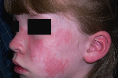 Juvenile dermatomyositis. Facial inflammation and telangiectasia. Note the involvement of the ear.