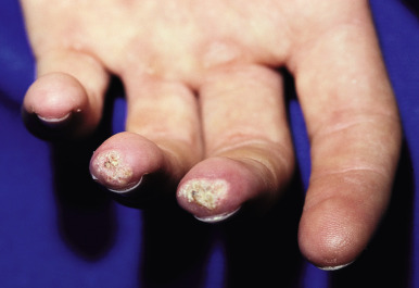 Juvenile dermatomyositis. Note calcinosis on the fingertips.