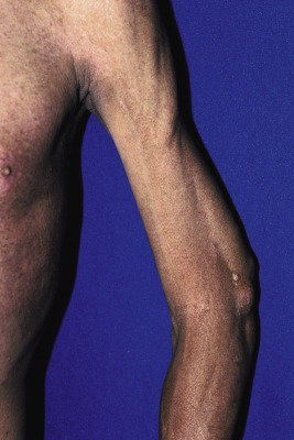 Juvenile dermatomyositis (JDM). Profound lipoatrophy on the limbs of a young adult with a history since elementary school of JDM.