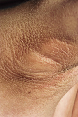 Contractures have been associated with the calcinosis and occur in 17% to 30% of patients with JDM. Lipodystrophy is a common feature in children with chronic disease, especially if poorly controlled and of longer duration, overall occurring in 9.7% of patients ( Figs. 22-32 and 22-33 ). The lipodystrophy may be generalized or partial and is characterized by a slowly progressive symmetric loss. The lipodystrophy is associated with insulin resistance and hyperlipidemia (hypertriglyceridemia and low levels of high-density lipoprotein [HDL]). These cardiac risk factors can be present in patients with chronic disease, even without the lipodystrophy. Acanthosis nigricans has been described in 10% of patients later in the disease course ( Fig. 22-34 ). The insulin resistance correlates with muscle atrophy, proinflammatory circulating cytokines, and a family history of diabetes, but not with corticosteroid use.