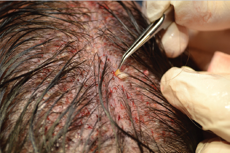 Fig. 83.2 Double follicular units (DFUs) after placement showing “snug” fit and correct epidermal elevation relative to the scalp.