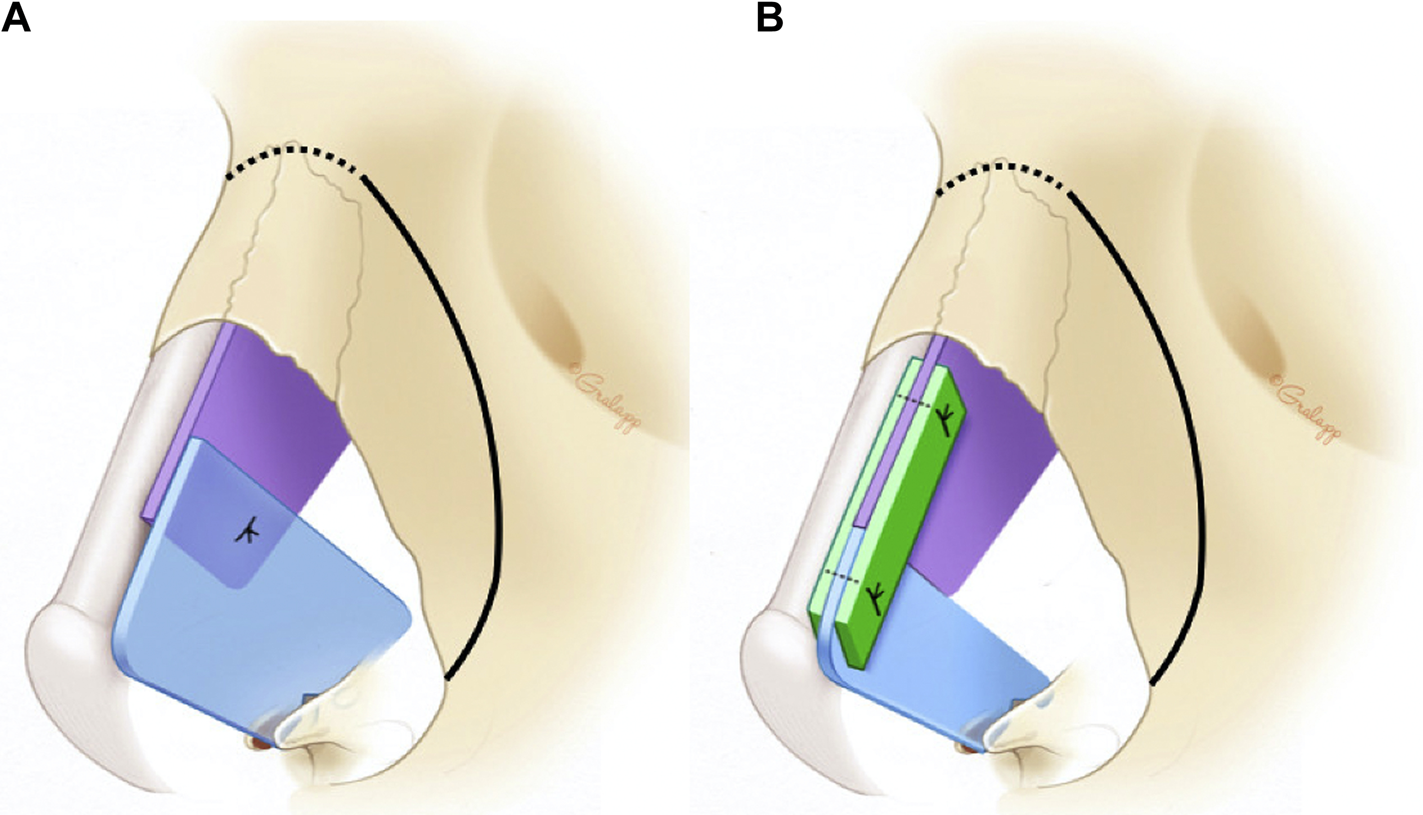 Subtotal septal reconstruction and the anterior septal reconstruction (ASR) techniques, both modifications of extracorporeal septoplasty, preserve the dorsal septum and thereby maintain the integrity of the keystone area. In the ASR method, the anterocaudal septal deviation is removed and a new caudal strut is reconstructed from either rib or septal cartilage. This strut is anchored to the remaining dorsal strut and placed into a groove in the nasal spine. The modified subdorsal strip method, by maintaining a strut of subdorsal cartilage, allows for the use of ASR in this particular DP method ( Fig. 2 ). In this technique, the ASR graft can be directly sutured to the dorsal strut in a side-to-side configuration (see Fig. 2 A) or it can be sutured in an end-to-end configuration (see Fig. 2 B). In the latter configuration, bilateral extended spreader grafts are used to stabilize the ASR graft. Notably, these spreader grafts differ from traditional spreader grafts because they do not sit between the native dorsal septum and the upper lateral cartilages (as the upper lateral cartilage attachment to the dorsal septum is preserved), but instead sit high along the remaining dorsal strut, just beneath the upper lateral cartilage. Fig. 3 demonstrates representative photographs of a patient undergoing an LD procedure with the modified subdorsal strip method technique combined with an ASR.