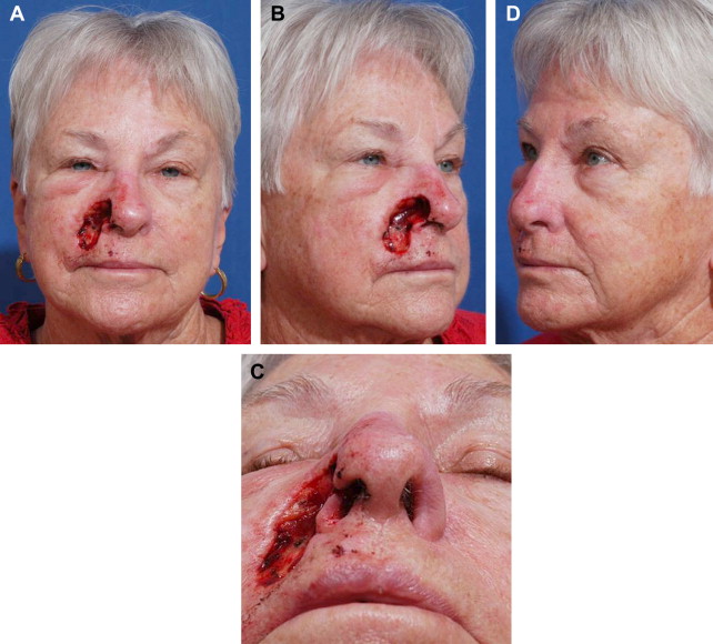 Anatomically, the skin is missing over the entire ala, part of the inferior sidewall, and the adjacent medial cheek and lateral lip. Soft tissue within the cheek over the piriform aperture has been excised. The normal fibrofatty middle layer support of the ala is gone. Nasal lining is intact.