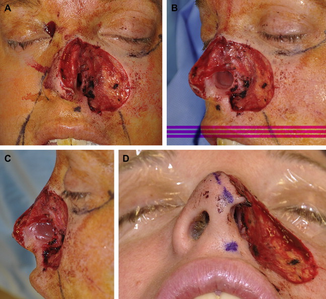 A 37-year-old-woman presented with a 4-year history of a left alar nasal lesion. The lesion tested positive for an infiltrative basal cell carcinoma. At the initial presentation, her ala was significantly retracted and she had a 4 cm ×2-cm indurated mass centered at the alar-facial sulcus that encompassed her entire left nasal ala and extended superiorly to the inferior nasal sidewall and laterally to the medial cheek. She underwent Mohs micrographic resection that resulted in a composite medial cheek and full-thickness nasal defect that included her left hemitip, dorsum, sidewall, and ala ( Fig. 1 ).