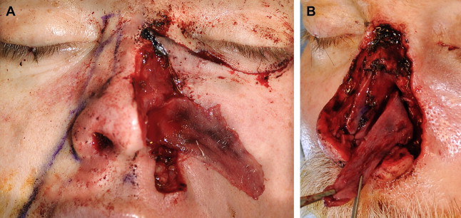 ( A ) Frontal view after reconstruction of medial cheek defect and harvest of caudally based ipsilateral septal mucoperichondrial internal lining flap. ( B ) Profile view of the same flap harvested in a different patient.