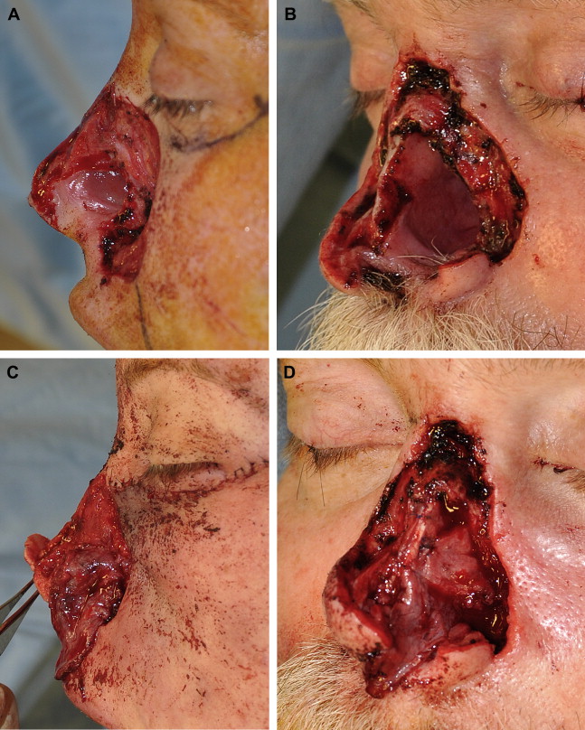 Composite cheek and full-thickness left nasal defect encompassing left hemitip, dorsum, sidewall, and ala. ( A ) Frontal, ( B ) left oblique, ( C ) profile, and ( D ) base views.