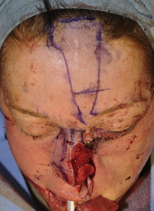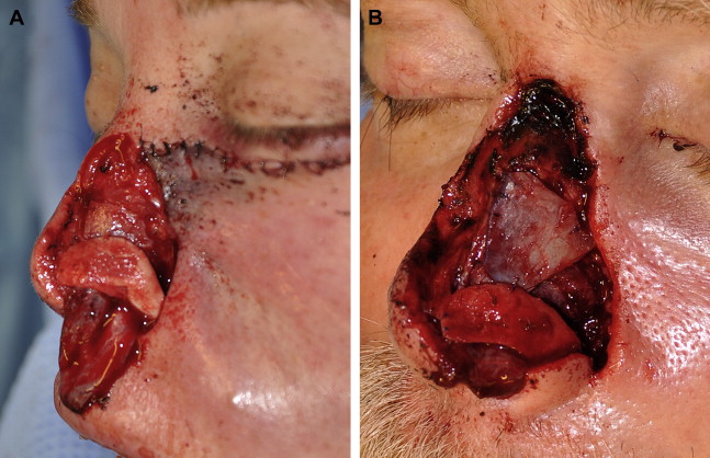 Options for reconstruction included a staged initial reconstruction of the cheek to set a platform for nasal reconstruction followed by a multistage nasal reconstruction of the full-thickness nasal defect. The second option was to perform simultaneous reconstruction of the cheek and nasal defect. Setting the nasal platform by first reconstructing the cheek alone may increase the total number of procedures; however, it decreases the risk of the nasal platform being displaced laterally and inferiorly as the cheek flap heals and contracts. The patient had a strong desire to minimize the number of operative procedures and total time for reconstruction, thus it was decided to perform the first stage full-thickness nasal reconstruction while simultaneously reconstructing the medial cheek defect.