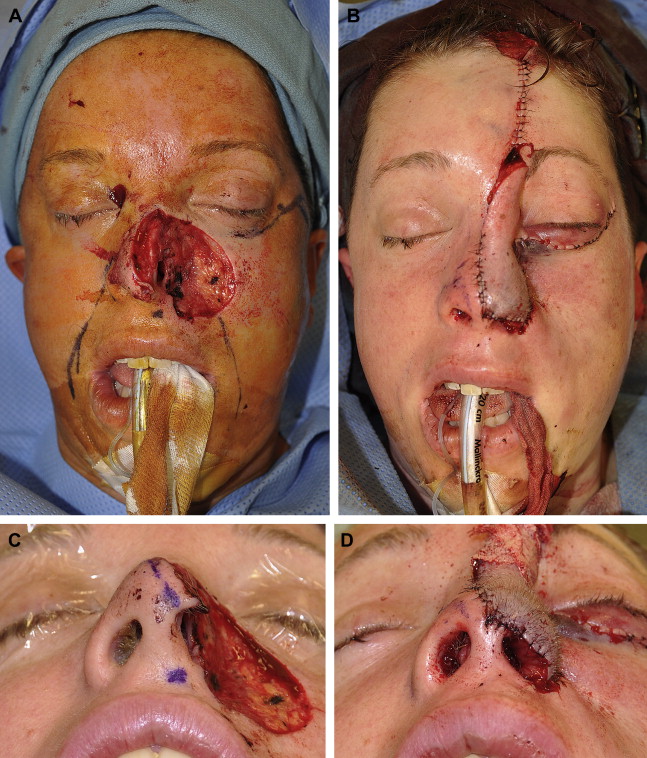 The cutaneous defect encompassed almost the entire left side of the nose (see Fig. 1 ). A paramedian forehead flap was designed using a template from the contralateral intact side for re-creation of the left hemidorsum, lateral nasal sidewall, ala, and hemitip. Conventional teaching describes that if 50% of a convex nasal subunit is missing, the entire subunit should be reconstructed, but adequate cosmesis can be achieved by reconstructing only half of the tip and dorsal subunits.