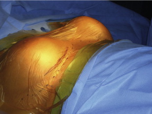 Options for revision in a patient with a capsular contraction have been well delineated. BASPI and additional options include: capsulotomy only, capsulectomy–partial or complete, capsular flap or neopocket with collapse of the capsule placing the new implant on top of the prior capsule, changing pocket planes, usually subglandular to partial subpectoral or dual-plane, and more recently adding a soft tissue matrix such as Alloderm or Strattice. It should also be mentioned that implant removal with or without capsulectomy may be performed without replacement. This is always an outpoint. The true etiology of capsular contracture is unknown; however the most common theories include a low-grade bacteria: bacterial theory and the hypertrophic scar theory secondary to blood, fluid or tissue trauma. It is likely that one or both play a role in each individual patient. Because the exact etiology is unknown, similar to deep vein thrombosis, I recommend doing everything possible to lower the incidence of capsular contracture or prevent it. In addition, technical points to maximize success and limit recurrence include: meticulous hemostasis and atraumatic technique, use of surgical drains with any capsulectomy, antibiotic irrigation such as the Adam’s solution, perioperative antibiotics, and the use of op-site or tegaderm over the nipple. If implant rupture is suspected placement of a protective barrier drape over the entire incision area and chest/breast region will limit contamination and silicone skin contact ( Figure 18.1 ).