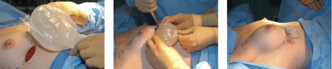 Insertion sleeve. A temporary plastic insertion sleeve is particularly useful when inserting heavily textured implants. I cut the sleeve in half and place antibiotic pocket irrigation fluid inside the pocket and sleeve. The assistant retracts and holds the twisted sleeve at the 6 o’clock position. After the inplant is in position, fingers are inserted inside the sleeve lifting up the implant off the chest and the posterior or deep side of the sleeve is removed first followed by the anterior sleeve.
