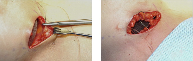 Hand-in-glove pocket dissection is performed for form stable implants. Lateral pocket dissection is implant independent but for smooth devices the superior or cranial pocket is developed to the second rib.