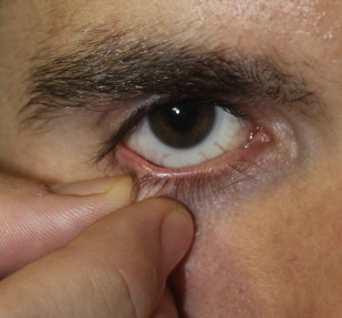 Lower eyelid evaluation is important to avoid classic postoperative complications including chemosis, ectropion, malposition of the lid, and dry eye syndrome (DES). The classic examination maneuver to assess lid laxity is the snap-test, where the examiner’s index finger is used to provide downward traction on the lower eyelid and then abruptly released ( Fig. 1 ). If the eyelid returns to the globe, this indicates a normal eyelid tone. Another examination maneuver to assess the lower eyelid is the distraction test where the examiner pulls the lower eyelid in an anterior vector. If the eyelid is able to be pulled 6 to 8 mm, this indicates lower lid laxity ( Fig. 2 ). The position of the medial and lateral canthus, the lower eyelid-cheek junction, and the presence of a negative vector eyelid should also be assessed. A negative vector eyelid is described as a prominent globe with a retrusive orbital rim ( Fig. 3 ). Patients with a negative vector lower eyelid are at an increased complication rate, particularly malposition of the eyelid.