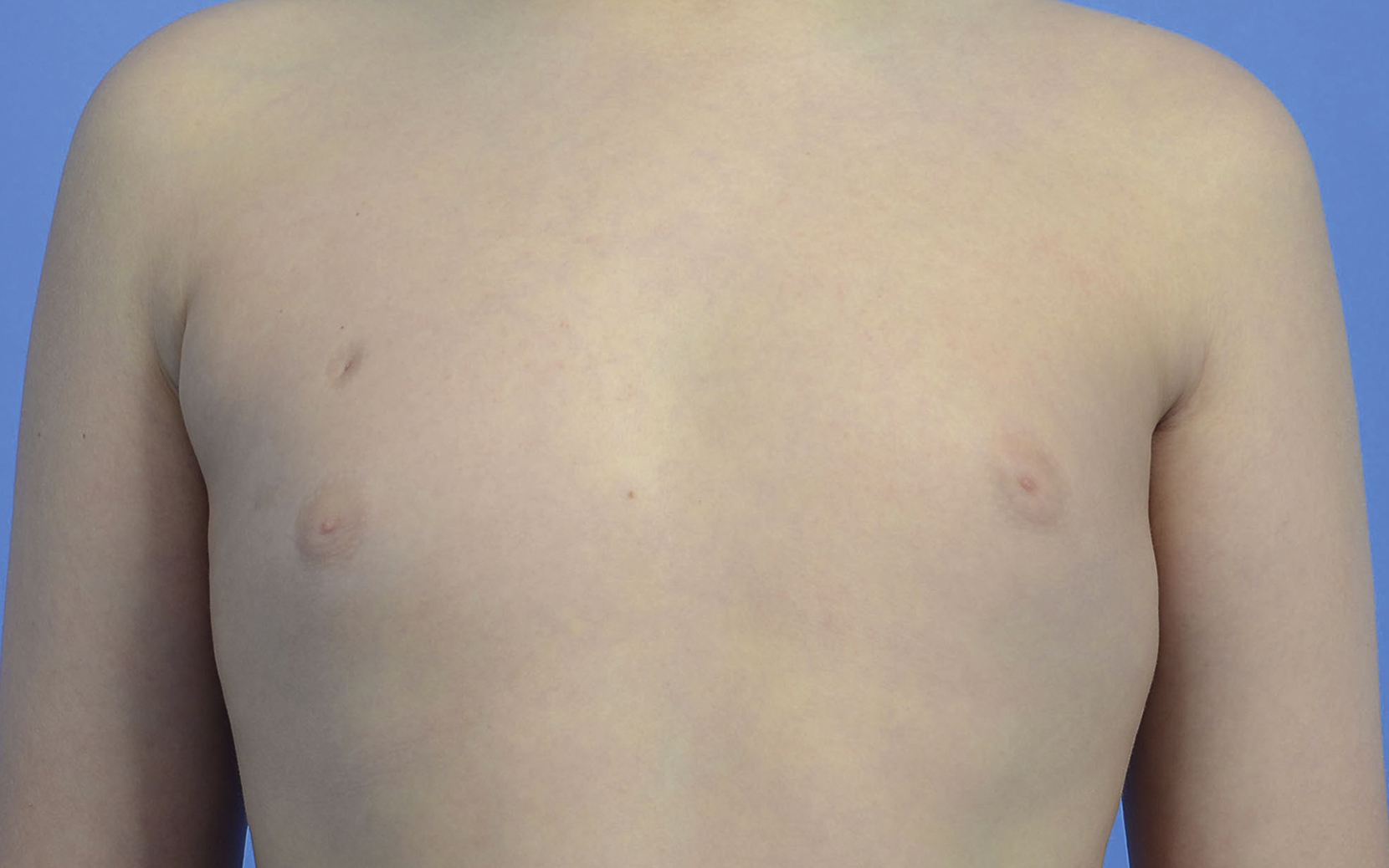 Gynecomastia, or abnormal benign proliferation of the male breast tissue, affects up to 65% of boys, peaking between the ages of 13 and 14 years ( Fig. 37.2 ). , Physiological pubertal gynecomastia is attributed to a disruption of balance between testosterone and estrogen, where there is a lag between rising testosterone and estradiol levels through puberty. This transient period of excess estradiol promotes glandular proliferation of the breast. Gynecomastia should not be confused with pseudogynecomastia, defined as adipose tissue giving the appearance of a female breast, without the presence of glandular tissue. Only 5–10% of gynecomastia persists beyond one year and spontaneous resolution occurs in the majority of patients. If the condition persists beyond one year, fibrosis and hyalinization occur, with regression of epithelial proliferation. These changes render the condition less amenable to medical therapy and increase the necessity for surgical intervention. Timing of surgical correction is based on the absence of a secondary cause for gynecomastia (e.g., endocrine), persistence of breast enlargement for greater than one year, as well as psychosocial impact on the patient. Simon proposed a classification system for gynecomastia, with grade 1 characterized by slight breast enlargement without skin redundancy, grade 2a moderate breast enlargement without skin redundancy, grade 2b moderate breast enlargement with marked skin redundancy, and grade 3 both marked breast enlargement and skin redundancy. Albeit physiological in the majority of cases, secondary gynecomastia must be ruled out by performing a thorough physical exam and history. Drug-induced gynecomastia is the most common secondary cause. A breast and testicular exam is recommended to rule out any rare secondary causes such as testicular malignancies. Other secondary causes include tuberous sclerosis, adrenal malignancies, and steroid hormone synthesis abnormalities. Preoperative evaluation by endocrinology should be considered if endocrinopathy is suspected on history or physical examination (such as galactorrhea, abnormal testicular examination, features of Klinefelter syndrome, abnormal visual field or funduscopic testing, rapid progression). Routine workup by an endocrinologist in patients with suspected physiological gynecomastia lasting less than a year with no suspicious findings is likely not necessary. Some authors suggest a more selective evaluation, recommending referral to endocrinology if gynecomastia persists beyond 16 years of age.
